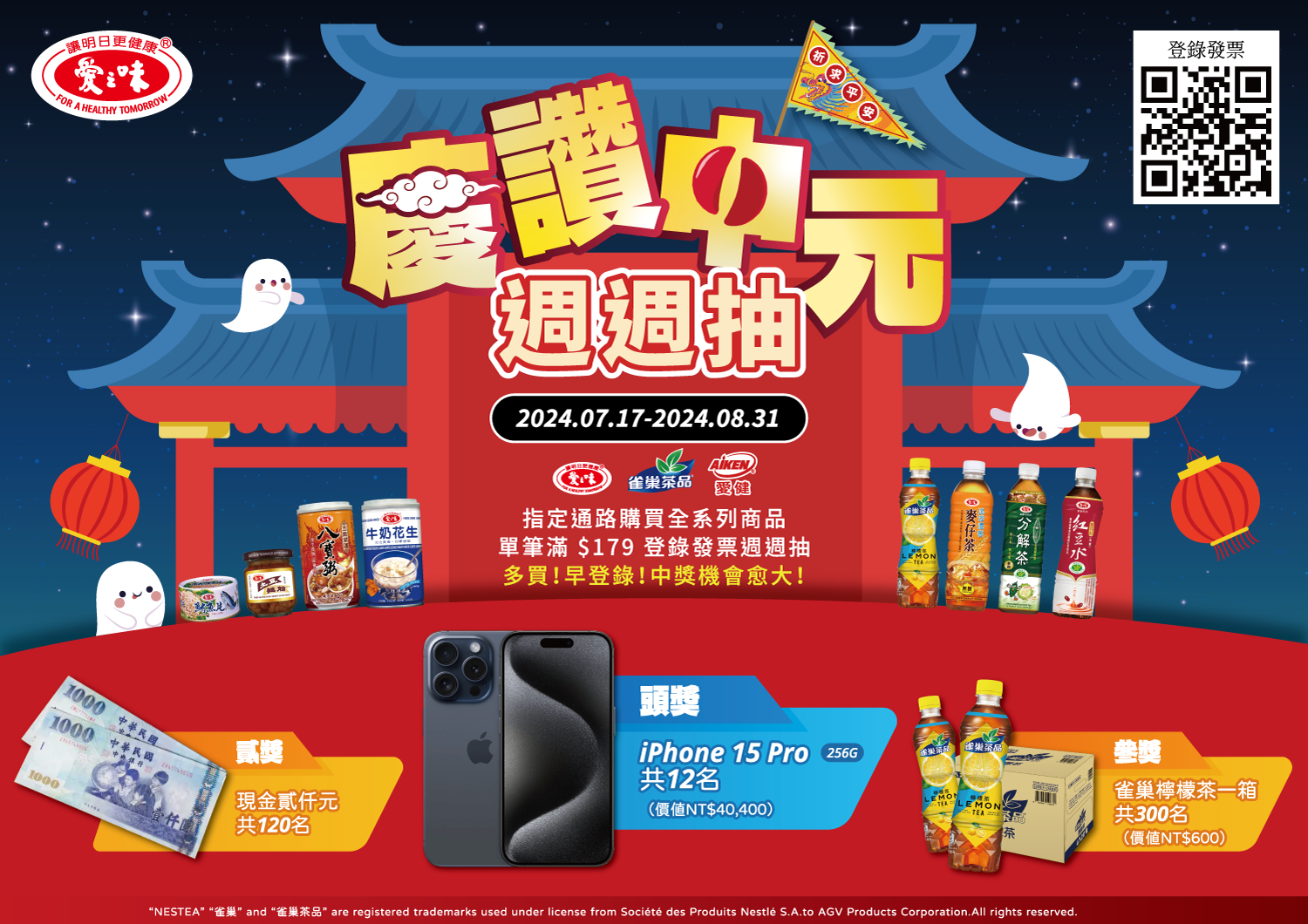 | 活動說明: | 購買「愛之味/ 愛健 / 雀巢茶品」全系列商品,單筆發票金額折扣後滿NT$179,活動網站登錄發票,參加慶讚中元週週抽獎。 |