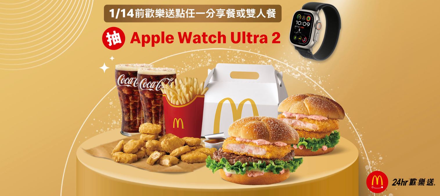 | 活動說明: | 活動期間於《歡樂送》點購限定餐組 (且無退款記錄),且於2025年1月15日中午12:00前至麥當勞APP中『我的帳號』勾選「我同意從電子郵件或簡訊或其他方式接收到台灣的麥當勞餐廳優惠活動及最新訊息的通知」,即可參加Apple Watch Ultra 2抽獎 (共12名)。 |