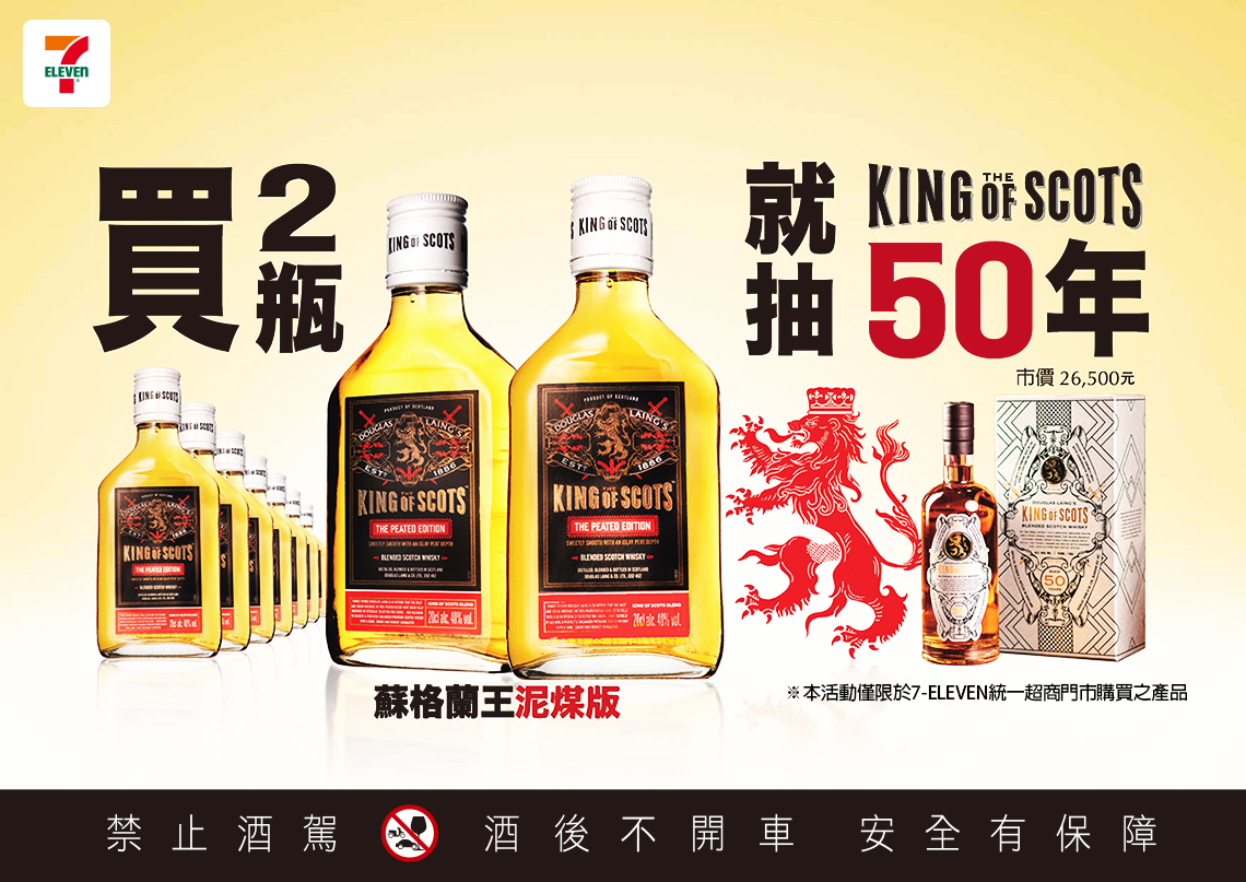 | 活動說明: | 活動期間於活動通路「單筆發票購買兩瓶蘇格蘭王泥煤版200ML」 ,活動網站登錄發票號碼,即可抽限量精美贈品。 |