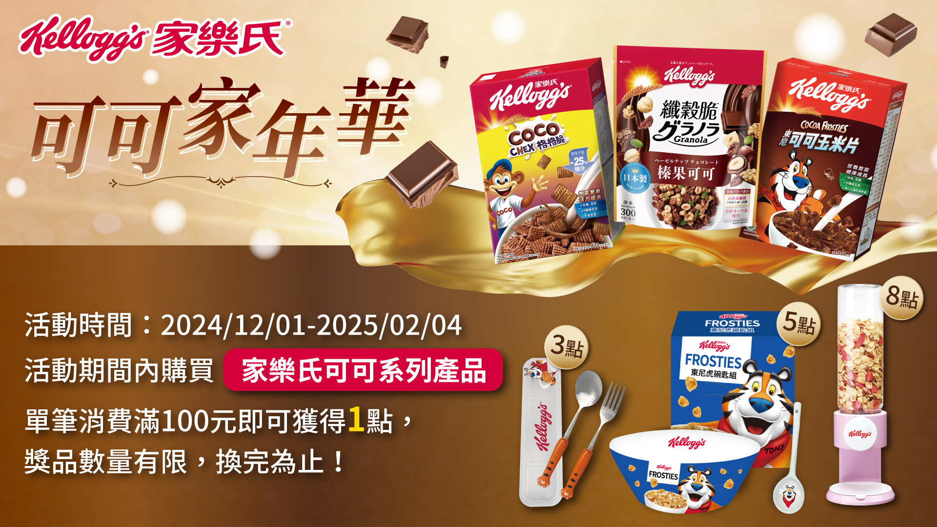 | 活動說明: | 活動流程: 【STEP1】購買『家樂氏可可系列』產品【STEP2】憑購買發票至活動網站登錄【STEP3】發票經審核通過即可獲得活動點數【STEP4】集滿指定點數至活動網站兌換好禮 活動集點期間:2024/12/01 00:00~2025/02/04 23:59※發票登錄期限至2025/02/09 23:59止(以活動網站系統之時間為準),未於活動辦法指定時間內登錄之發票視為自動放棄參加活動資格品牌好禮兌換期間:2024/12/01 00:00~2025/02/14 23:59※品牌好禮兌換期限至2025/02/14 23:59止(以活動網站系統之時間為準),未於活動辦法指定時間內完成兌換視為自動放棄兌換權利活動辦法:活動期間內購買『家樂氏可可系列』產品(請參閱下方活動品項),憑購買發票至活動網站登錄,單筆消費滿100元即可獲得1點,經審核通過即可獲得活動點數,集滿指定點數即可於活動網站進行兌換品牌好禮,獎品數量有限,換完為止! |