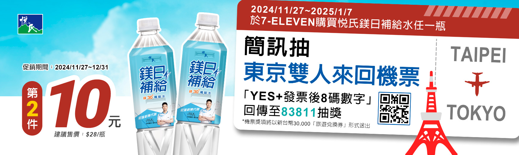 | 活動說明: | 活動期間2024/11/27(三) ~ 2025/01/07(二),於指定通路7-ELEVEN購買悅氏鎂日補給鎂30補給水880ml任一瓶,手機編寫簡訊『YES+發票後8碼數字』傳送至83811,就有機會獲得日本東京雙人來回機票(不指定航空公司)、現金2,000元等好禮(活動簡訊參加費用每則5元)。 |