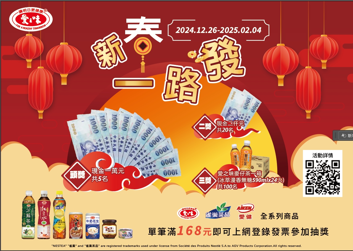 | 活動說明: | 購買「愛之味/ 愛健 / 雀巢茶品」全系列商品,單筆發票金額折扣後滿168元,於活動網站登錄發票,即可參加抽獎。 |