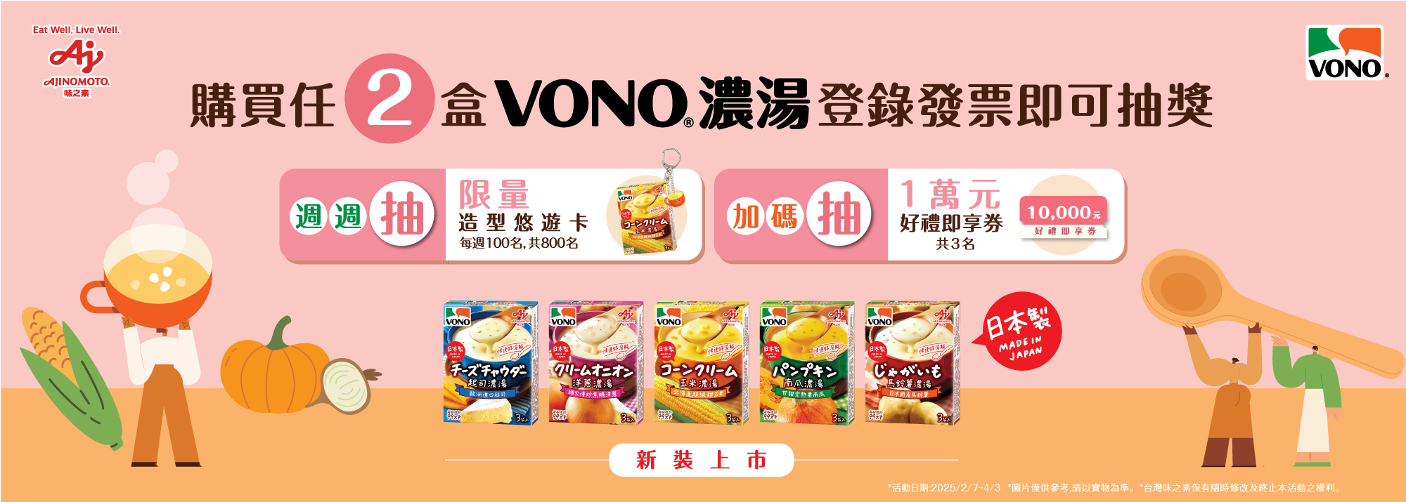 | 活動說明: | 活動期間內單筆購買VONO®濃湯指定口味任2盒(限玉米濃湯、馬鈴薯濃湯、南瓜濃湯、起司濃湯、洋蔥濃湯),至活動網站登錄發票號碼等相關資料並上傳發票照片週週抽VONO®限量造型悠遊卡。最後一週加碼再抽1萬元好禮即享券! ※每個手機門號分別有「週週抽」悠遊卡3次中獎機會、「加碼抽」1萬元好禮即享券1次中獎機會。 ※抽中「週週抽」悠遊卡,將依中獎者所登錄之資料進行審核,不需寄回發票正本兌獎,抽中2個以上者請依照下方【兌獎說明】完成兌獎流程,逾期或未完成者僅能兌領1個悠遊卡,剩餘獎項視同放棄;抽中「1萬元好禮即享券」,中獎者需寄回發票正本兌獎,並請依照下方【兌獎說明】完成兌獎流程,逾期或未完成者視同放棄,請務必妥善保管參加發票正本。 |