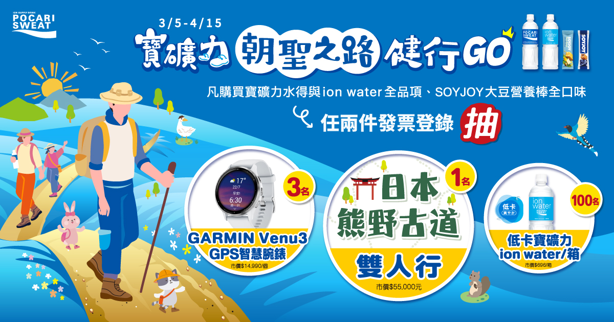 | 活動說明: | 1. 活動期間於全通路購買:寶礦力全系列商品、SOYJOY全系列商品『任2件』,登錄消費發票即可參加抽獎。 2. 登錄方式: 加入寶礦力水得LINE官方帳號好友,憑購買發票完成登錄流程,即有機會抽中「日本熊野古道健行雙人遊」、「GARMIN Venu 3 GPS 智慧腕錶」、「寶礦力水得(低卡)ion water 580ml 乙箱」,於7-ELEVEN及全家便利商店購買,還可再抽獨家好禮! ※於本活動網站登錄發票資料務必確實填寫,中獎發票之購買產品及數量若與登錄之資料不符,則判定喪失得獎資格,亦不可以其他購買發票遞補。 ※ 每張發票為一個抽獎資格,中獎後需提供相關資料來兌獎,故請妥善保存登錄之『紙本發票及明細正本』,以確保相關兌獎權益;而雲端發票(電子發票存載具者),請詳閱活動辦法說明來進行兌獎。 |