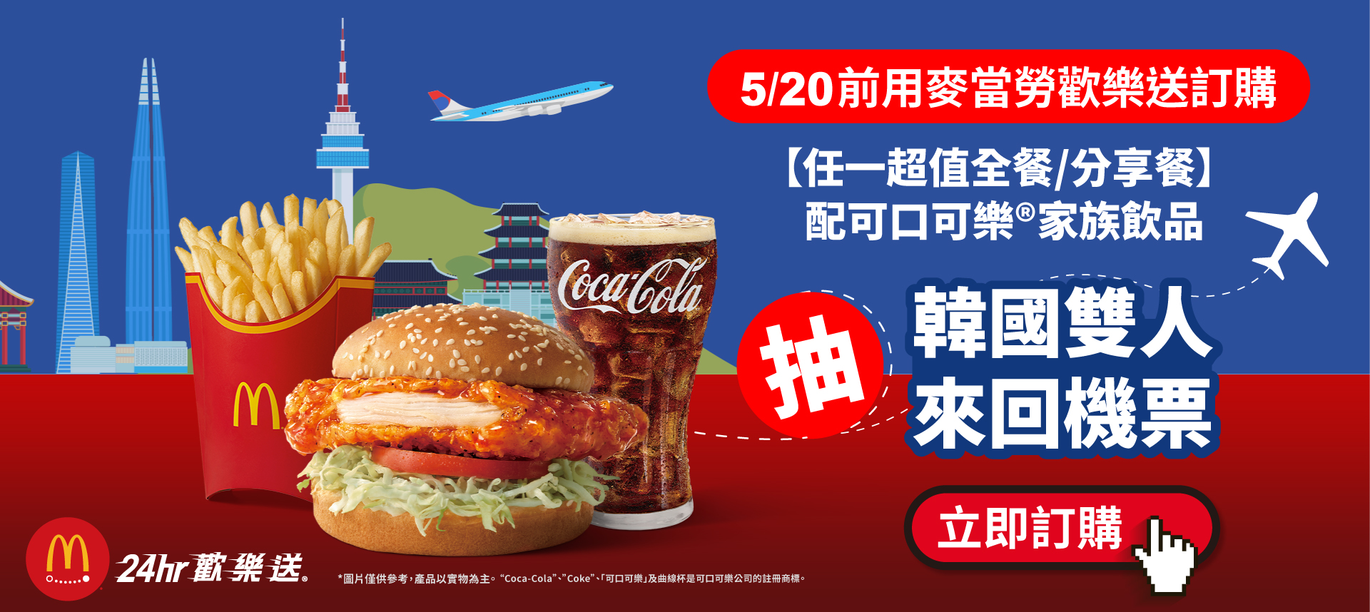 | 活動說明: | 活動期間於麥當勞訂歡樂送,點購超值全餐或分享餐並配餐飲料皆搭配可口可樂®系列飲品(且無退款記錄),且於2025年05月21日中午12:00前至麥當勞APP中『我的帳號』勾選「我同意從電子郵件或簡訊或其他方式接收到台灣的麥當勞餐廳優惠活動及最新訊息的通知」,即可參加雙人韓國來回機票抽獎(共10名)。 |