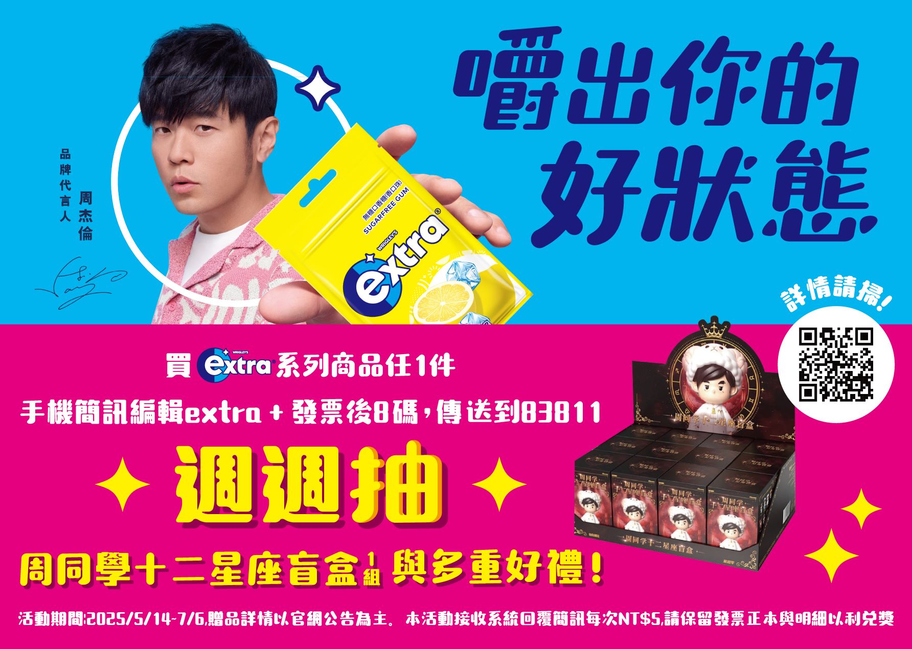 | 活動說明: | 2025/05/14 00:00起 ~ 2025/07/06 23:59止 ,於全台所有販售「EXTRA」的通路,購買全品項任一件,以簡訊編輯「EXTRA+發票後八碼,傳送至號碼83811登錄發票」,即可參加周同學週週抽多重好禮! (登錄範例參考:extra22335588) (*提醒:參與者購買商品時需向店家提供索取紙本發票或電子發票購買明細,若存於載具請上財政部二代電子發票平台拍照或截圖存檔該筆發票消費明細) |
