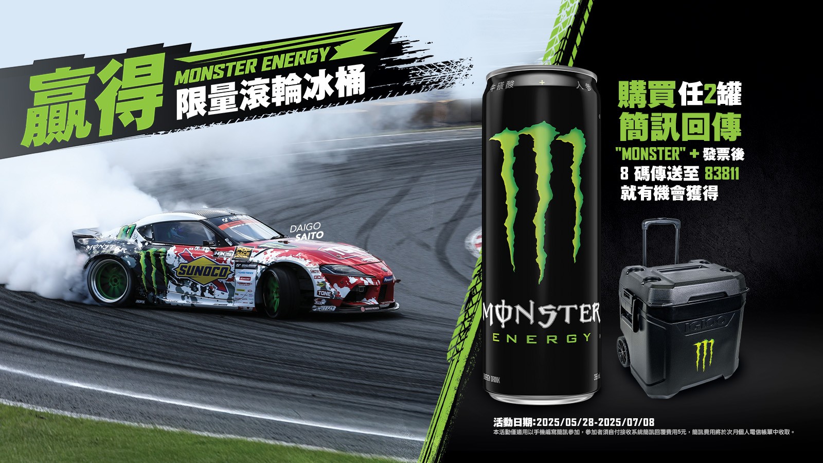 | 活動說明: | 活動期間於統一超商單筆發票購買Monster Energy® 全系列 (魔爪/超越/芒果狂歡/管浪潘趣/超越仙境/超越蜜桃閃耀/澳式檸檬)任兩罐以上,手機編寫簡訊『7EMonster+發票後八碼』傳送到83811就有機會抽中限量滾輪冰桶!如有疑問,請於週一到週五10:00-17:00來電本活動客服專線02-25171326#12 (國定例假日及過年期間恕不提供接聽服務)。 ※以上活動條件僅限於單張發票,恕不跨通路或累計發票合併參加。 |