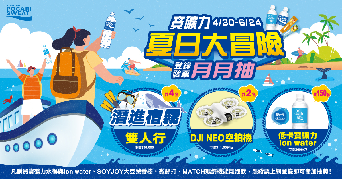 | 活動說明: | 1. 活動期間於全通路購買:寶礦力水得全系列商品、SOYJOY大豆營養棒全系列商品、微舒打微氣泡葡萄口味果汁飲料、MATCH瑪綺機能氣泡飲任1件,登錄消費發票即可參加抽獎。 2. 登錄方式: 加入寶礦力水得LINE官方帳號好友,憑購買發票完成登錄流程,即有機會抽中「潛進宿霧雙人行」、「DJI NEO空拍機」、「寶礦力水得(低卡)ion water 580ml 乙箱」,於7-ELEVEN及全家便利商店購買,還可再抽獨家好禮! ※於本活動網站登錄發票資料務必確實填寫,中獎發票之購買產品及數量若與活動規範不符,則判定喪失得獎資格,亦不可以其他購買發票遞補。 ※ 每張發票為一個抽獎資格,限登錄乙次且僅有乙次中獎機會及兌獎資格。中獎後需提供相關資料來兌獎,故請妥善保存登錄之『紙本發票及明細正本』,以確保相關兌獎權益;而雲端發票(電子發票存載具者),請詳閱活動辦法說明來進行兌獎。 |