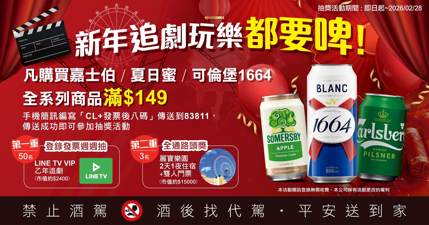 | 活動說明: | 活動期間內,凡購買『嘉士伯/可倫堡1664/夏日蜜全品項商品,單筆發票折扣後金額滿 $149』,手機簡訊編寫「CL+發票後八碼」傳送到83811,傳送成功即可參加嘉士伯週週抽「LINE TV VIP 1年追劇」!再加碼,有機會抽中「麗寶樂園 2 天 1 夜住宿+雙人門票」大獎! ※ 每支手機門號不限制參加次數,每張發票限登錄乙次,並僅享有乙次中獎機會;重複登錄者視為無效。 ※ 發票號碼一經登錄後,不得要求以任何形式要求取消或刪除;若退貨則喪失參加本活動之資格,且本活動限非營業買受人參加,登錄之發票不得打入買方之統一編號。 ※ 發票需能清楚辨識購買時間、指定通路及商品明細及金額,請務必保留發票正本與購買明細,中獎時寄回主辦單位驗證,以辦理後續領獎事宜。電子發票/載具發票亦需保留銷貨明細,以供兌獎證明。 ※ 所有中獎者將以簡訊發送中獎通知,未中獎者恕不另行通知。 |
