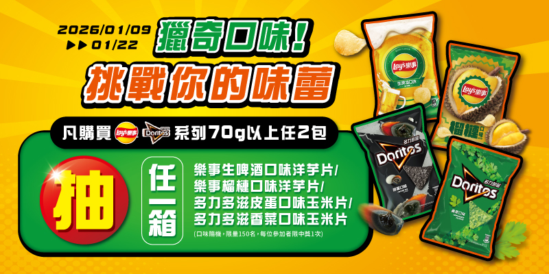 | 活動獎項: | 樂事生啤酒口味洋芋片/樂事榴槤口味洋芋片/多力多滋皮蛋口味玉米片/多力多滋香菜口味玉米片,任一箱 (口味隨機)/位,共150名 |