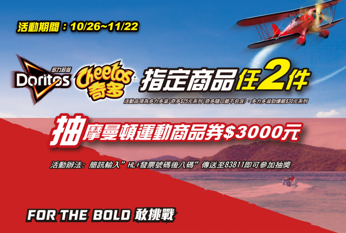 | 活動說明: | 活動期間內於萊爾富購買多力多滋/奇多$25元系列商品(奇多隨口脆不包含)/多力多滋勁爆脆$30元系列商品任二件,以簡訊編寫HL+發票號碼後八碼至83811,即可參加抽獎。 (發票需能清楚辨識購買時間、購買通路及商品明細及金額) |