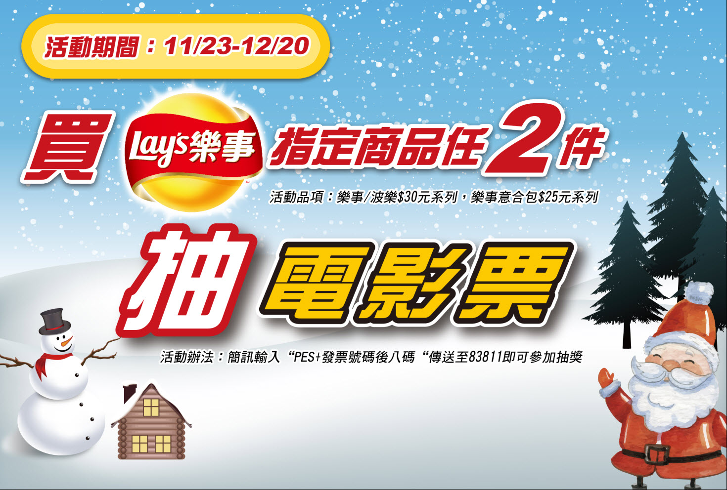 | 活動說明: | 活動期間內於萊爾富便利商店購買樂事指定商品(樂事/波樂$30元系列,樂事意合包$25元系列)任二件,以簡訊編寫PES+發票號碼後八碼至83811,即可參加抽獎。 (發票需能清楚辨識購買時間、購買通路及商品明細及金額) |