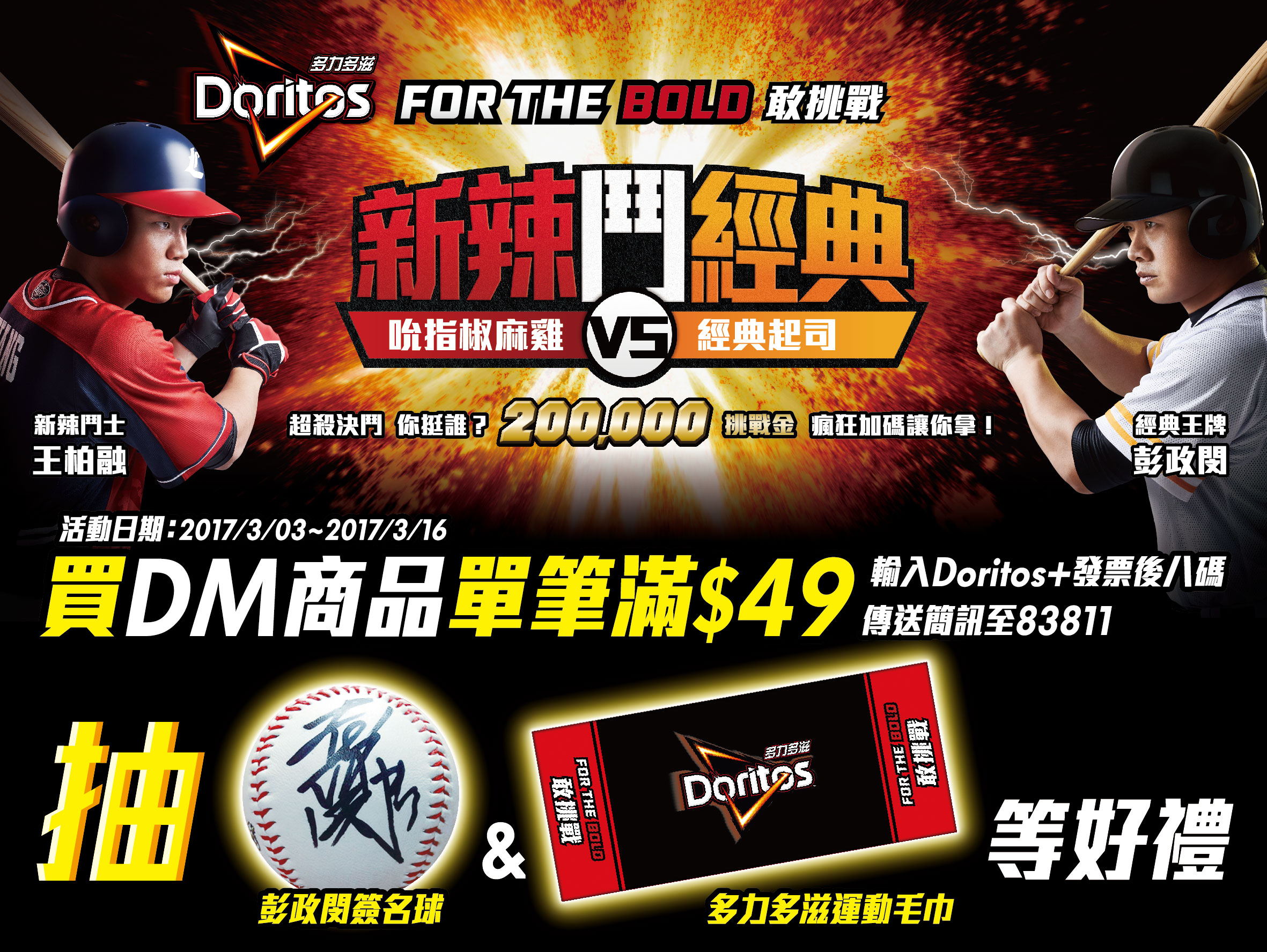 | 活動獎項: | 彭政閔簽名球,共20顆 多力多滋運動毛巾,共500條 |