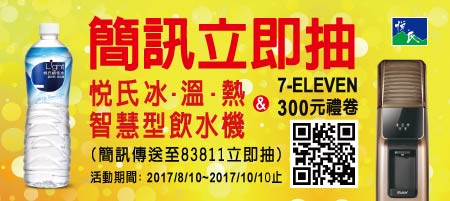 | 活動獎項: | 悅氏SAY飲水機1台+12L鹼性水五桶 (共15名) 市價$16,700元 中獎者可依飲水機顏色喜好選擇其一出貨 : 雪花白、豪邁紅、香檳金、星砂銀,欲知更多產品資訊請上【悅氏官方網站】 7-ELEVEN 300元禮券 (共300名) 市價$300元 |