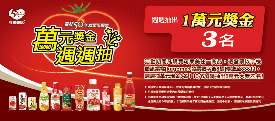 | 活動說明: | 活動期間凡購買可果美全系列商品任一件,憑發票以手機簡訊編寫《kagome+發票數字後8碼》傳送至83811,週週抽萬元現金3名! 10/6加碼抽出5萬元大獎乙名! |