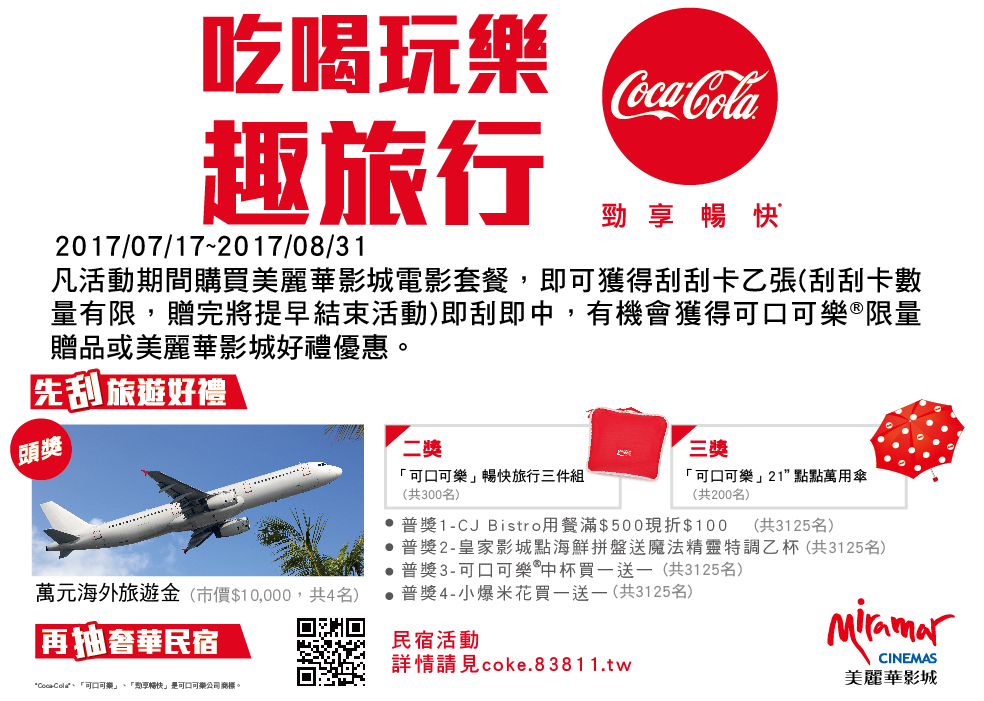| 活動說明: | 第一重刮刮樂:凡活動期間購買美麗華影城電影套餐,即可獲得刮刮卡乙張(刮刮卡數量有限,贈完將提早結束活動。) 即刮即中,有機會獲得可口可樂®限量贈品或美麗華影城好禮優惠。 第二重加碼抽: 即日起-2017/09/30購買符合上述產品組合之發票,以手機編寫簡訊輸入”Coke+發票後八碼”傳送至83811即有機會抽中奢華民宿包棟遊(指定民宿四選一)。 (第二重加碼抽為跨通路之聯合促銷活動,請保留發票正本及明細,以便日後兌獎,本活動參加簡訊費用每則五元)相關活動詳情請上coke.83811.tw或洽活動客服專線02-25022202#13。 |