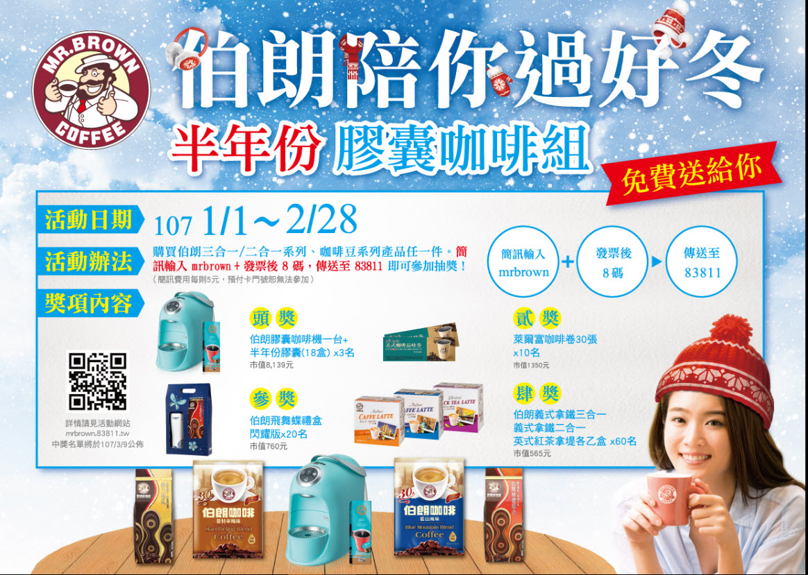 | 活動說明: | 活動期間內,於通路購買伯朗三合一/二合一系列、咖啡豆系列產品任一件,以簡訊輸入『mrbrown+發票後8碼』傳送至83811,就有機會抽中半年份膠囊咖啡組! |