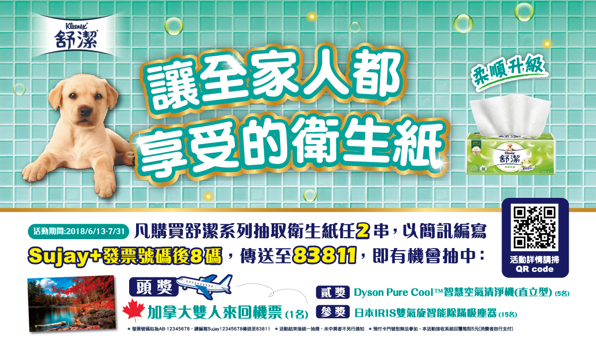 | 活動說明: | 於活動期間內購買『舒潔系列抽取衛生紙任兩串』,以簡訊編寫『Sujay+發票號碼後八碼』傳送至83811,登錄成功即可參加抽獎。 ※登錄成功通知簡訊每則5元,簡訊費用將由消費者自行負擔,於次月行動電話帳單中收取。 ※發票號碼如為AB-12345678,請以手機編寫 Sujay12345678,傳送至83811即可! |