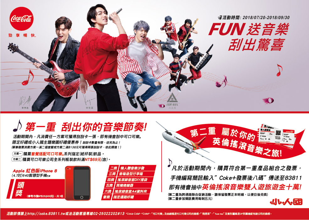 活動期間內,凡消費任一方案可獲得刮刮卡一張,即有機會刮中可口可樂®限定好禮或小人國主題樂園好禮優惠券。(單筆發票消費方案一滿二個套餐 / 方案二滿$138元可獲得兩張刮刮卡,依此類推!
