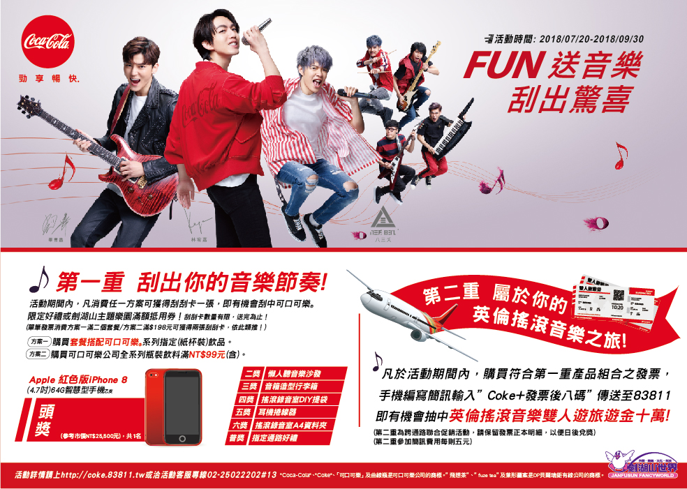 | 活動說明: | 方案一:購買套餐搭配可口可樂®系列指定(紙杯裝)飲品。 方案二:購買可口可樂公司全系列瓶裝飲料滿NT$99元(含)。 活動期間內,凡消費任一方案可獲得刮刮卡一張,即有機會刮中可口可樂®限定好禮或劍湖山主題樂園滿額抵用券。(單筆發票消費方案一滿二個套餐 / 方案二滿$198元可獲得兩張刮刮卡,依此類推!) 第二重加碼抽(跨通路活動): 凡活動期間內購買符合第一重上述產品組合之發票,以手機編寫簡訊輸入”Coke+發票後八碼”傳送至83811-即有機會抽中英倫搖滾雙人之旅共乙名。 |