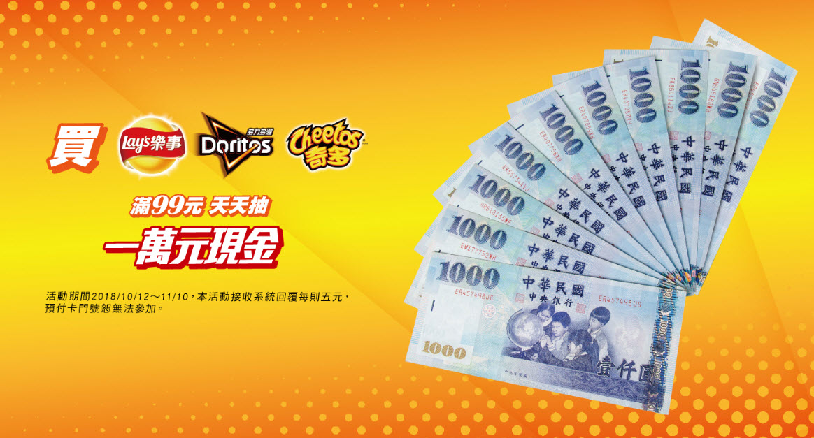 | 活動說明: | 活動期間內購買樂事/多力多滋/奇多單筆滿99元(以折扣後金額計算),手機簡訊編寫「PES+發票號碼後八碼數字」傳送至83811參加抽獎,天天送現金一萬元。 ※若電子發票存於載具,請務必於購買商品時告知店家印出紙本發票及明細 ※發票需能清楚辨識購買時間、購買通路及商品明細及金額 |