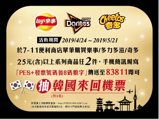 | 活動說明: | 活動期間內於7-11便利商店單筆購買樂事/多力多滋/奇多25元(含)以上系列商品任2件,手機簡訊編寫「PES+發票號碼後八碼數字」傳送至83811,即可抽韓國來回機票(共3名)。 ※若電子發票存於載具,請務必於購買商品時告知店家印出紙本發票及明細 ※發票需能清楚辨識購買時間、購買通路及商品明細及金額 |