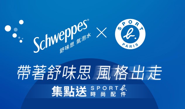 | 活動獎項: | ● SPORT b. 後背包,兌換點數300點,限量20個 ● SPORT b. 零錢包,兌換點數150點,限量100個 ● Schweppes® x SPORT b. 聯名帆布袋,兌換點數40點,限量2,500個 ※ 為維護公平性及所有參加者權益,後背包及零錢包獎項,每個註冊帳號僅限各兌換一個,聯名帆布袋獎項每個註冊帳號僅限兌換五個。 ※ 獎項數量有限,換完為止,恕不加量。兌換順序以主辦單位系統時間為準。 |